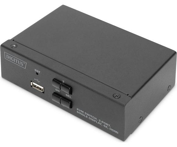 Digitus DS-12870 2 Port KVM Switch │ Single Display │ Rezolucija UHD: 4K / 30 Hz (3840 x 2160p) / Subsampling: YUV 4:4:4 │ Ulazi: 2 x HDMI® ulaza (2x1), 2 x USB B, 2 x audio kombinovana utičnica 3,5 mm jack (mikrofon, zvučnik) │ Izlazi (konsola): 1 x HDMI®, 2 x USB A (miš, tastatura), 2 x stereo audio 3,5 mm jack (mikrofon, zvučnik) │ EAN: 4016032467175