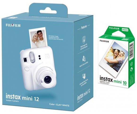Fujifilm Instax Mini 12 Film Camera, White + Instax Mini Glossy Paper, 10 Pcs. ISO osetljivost: 5 - 14.5, Veličina slike: 86 x 54 mm, Maksimalna fokalna dužina (ekvivalent filma od 35mm): 60 mm, Veličine filma: 62 x 46 mm, Struktura objektiva: 2/2, Prioriteti blende AE, Najveća brzina zatvarača fotoaparata: 1/2 s, 2xAA baterije (bijela)