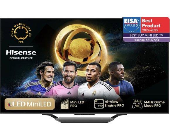 HISENSE 65U7NQ 65" 4K ULED Mini-LED VIDAA OS Smart TV pametni televizor, Displej: 65" LED, 4K Ultra HD (3840 x 2160 piksela), Mini LED, 144Hz, HDR: Dolby Vision, HDR10, HDR10+, HLG, Smart TV: VIDAA U7.6 OS, Zvuk: 2.1 kanala, 40W, Dolby Atmos, DTS:X, ugrađeni sabvufer, Mreža: Wi-Fi, Bluetooth 5.0, Ethernet, Portovi: 4x HDMI 2.1, 1x USB 2.0, 1x Optički audio, 1x Izlaz za slušalice, Dimenzije sa postoljem: 1449 x 899 x 295 mm, 20.8 kg