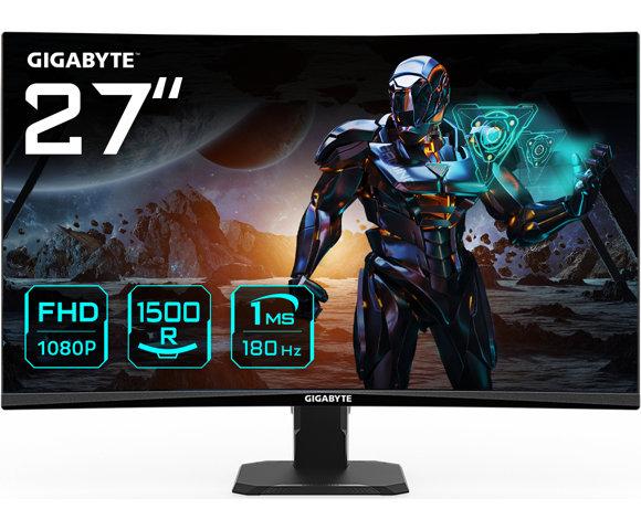 Gigabyte GS27FC EK1 27" FHD 180Hz 1ms zakrivljeni gaming monitor, Dijagonala: 27 inča, Rezolucija: 1920 x 1080 (Full HD), Tip panela: VA (LED), Zakrivljenost: 1500R, Osvetljenje: 250 nita, Odziv: 1ms (MPRT), Osvežavanje: 180Hz, Adaptive Sync: AMD FreeSync Premium, Uglovi gledanja: 178° H / 178° V, Boje: 16,7 miliona (108% sRGB), Portovi: 2x HDMI 2.0, 1x DisplayPort 1.4, 1x 3.5mm audio izlaz, VESA montaža: 100 x 100 mm, Energetska klasa: E, Dimenzije (sa postoljem): 610,5 x 208 x 441 mm, Težina: 4,53 kg, Ostalo: Eyesafe 2.0, Flicker-free, HDR Ready, Low Blue Light