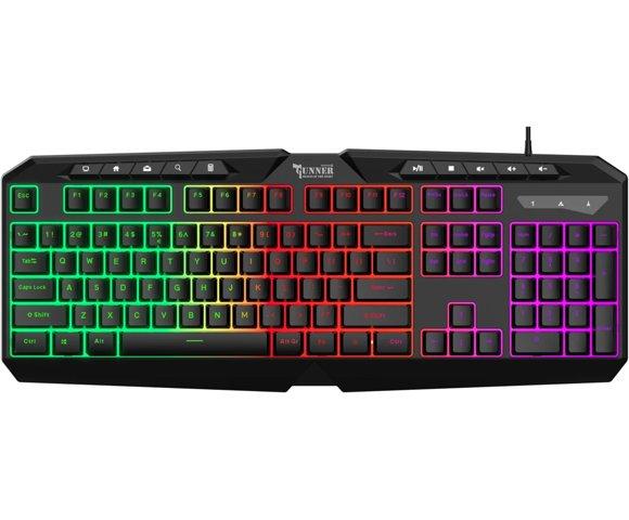 Swissten GUNNER gaming tastatura, Tip: Membranska tastatura, Broj tastera: 104 (10 multimedijalnih), RGB profili: 3, Zaštita: IPX4, Životni vijek: 50 miliona klikova, Dimenzije: 441x176x32 mm, Materijal: TPU + plastika, Težina: 620g, Raspored: Engleski